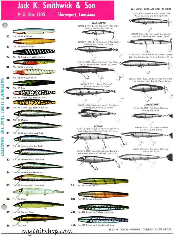 以下の1970年のカタログにも記載されているように、当時のモデルは「B1200」「A1200」という品番で販売されており、いずれもラトル(内部の音響機構)を搭載していない“ノンラトル仕様”でした。この初期型ログは、後のラトリングログの礎となる存在であり、ジャークベイトの進化の歴史を語るうえで欠かせない一章です。