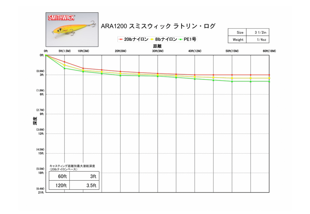 以下の図にある様に「ラトリングログARA1200」の限界潜行深度は、兄貴分である「ARB1200」と同等であり、60ftリトリーブ約90m(約3ft)前後に到達します。この潜行レンジを基準に、同サイズ(3.5インチ)のジャークベイトを“ゾーン別”に使い分けることで、より戦略的なアプローチが可能になります。