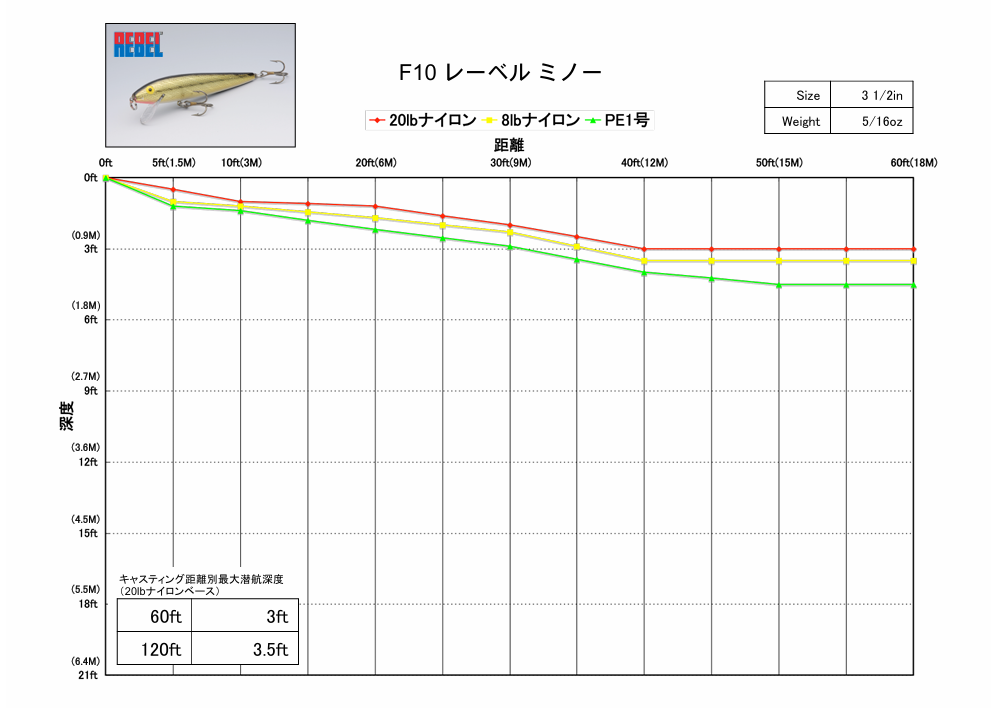 一方、浅いレンジを丁寧に探るなら「レーベルミノー F10」が適任です。こちらも3.5インチサイズで、60ftリトリーブ時の限界潜行深度はARA1200と同程度です。