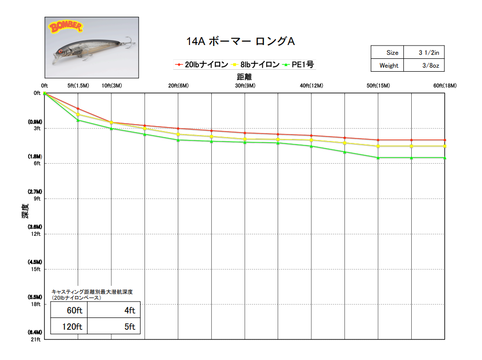 深いレンジを狙うなら、「ボーマー ロングA 14A」が有力な選択肢です。ナイロンライン20lbを使用し、60ftリトリーブすると最大で5ft(約1.5m)まで潜行可能。