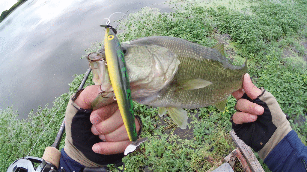 色々なアクションを試しながら探っていたものの、なかなかバイトが得られず…。しかし、着水後にリールのブレーキ設定を見直してからアクションを始めたところ、写真のバスが控えめながらもバイトしてくれました。風のない状況だったため、バイトも繊細で、集中力が試される展開でした。