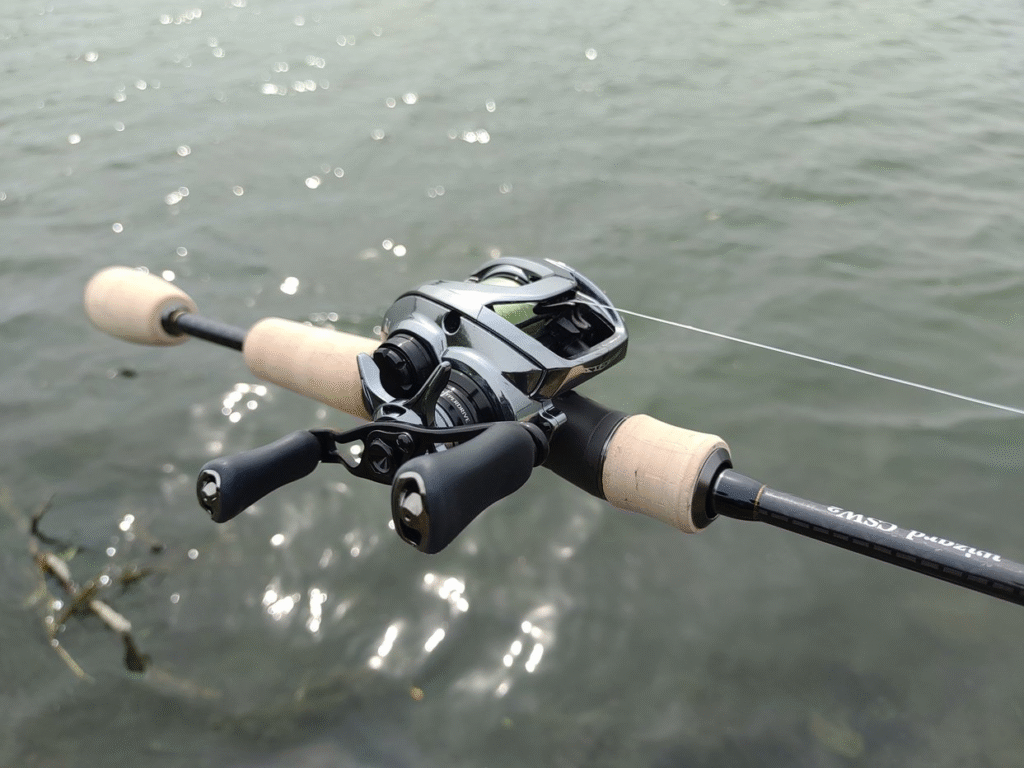 ギア比は7.1のモノを使っています。広範囲にキャストするにしても徐々に距離を伸ばしてエリアを探る場合に同じリトリーブパス上にルアーをアクションさせ続けるのは効率が悪いので、ストライクゾーンを離れたらルアーを即座に回収したいのでハイスピードタイプを使っています。