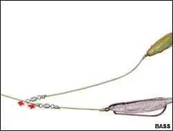 メインラインの先端には固定されたスイベルと8インチのリーダーを結び、もう一方のスイベルはメインライン上を自由に上下移動できるようにし、12インチのリーダーを接続します。