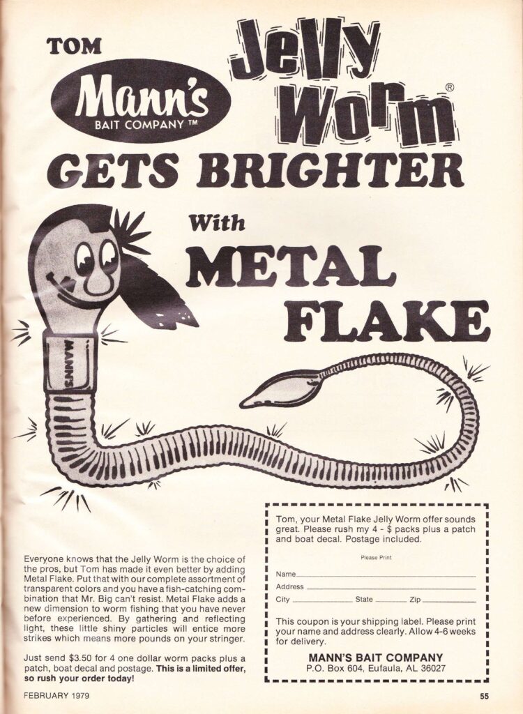 80年代にはタックルショップに入ると、マンズ社のジェリーワームから香る果物のいい香りが店内を包んでいました。ジェリーワームは、2008年のファルコンレイクで行われたBASSのトーナメントでは4DAYSレコード(132lb8oz)を樹立しています。