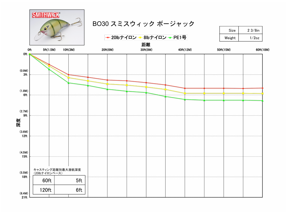 復刻版ボージャックの潜行性能については、ナイロンライン20lbを使用した場合、約3メートルのリトリーブで最大90cmまで潜行する設計となっています。これは、同じ潜行角を持つクランクベイトとして知られる「BO5SL ボーマー スクエアA」と近い性能です。